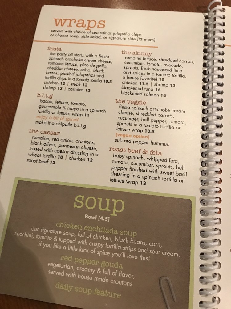 Bacon, lettuce, tomato, guacamole and mayo in a spinach tortilla. Choose a side: Sea Salt Chips, Jalapeno Chips, Signature Soup : $.